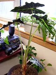 I have finally gotten everything back together to get from the camera to the blog! Meanwhile, my Alocacia x Amazonica has blossomed again and unfurled another new leaf.